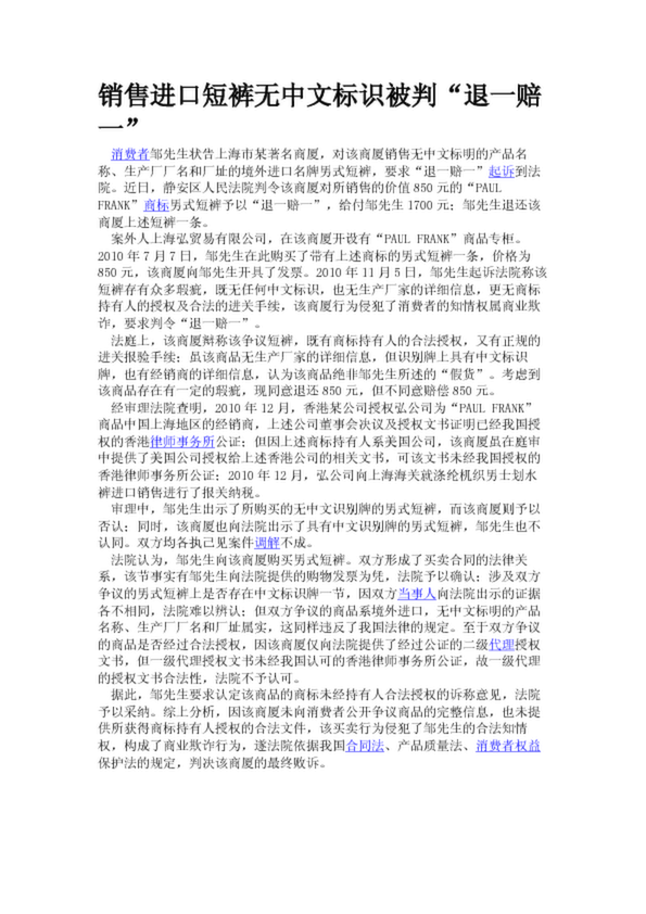 銷售進(jìn)口短褲無(wú)中文標(biāo)識(shí)被判“退一賠一”