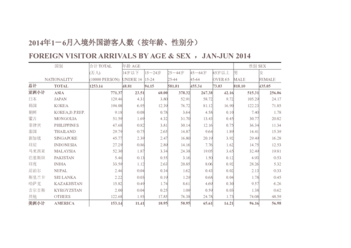 2014年1-6月入境外國(guó)游客人數(shù)(按年齡、性別分)